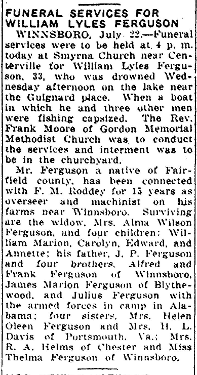 WINNSBORO, July 22, – Funeral services were to be held at 4 p.m., today at Smyrna Church near Centerville for William Lyles Ferguson, 33, who was drowned Wednesday afternoon on the lake near the Guignard place. When a boat in which he and three other men were fishing capsized. The Rev. Frank Moore of Gordon Memorial Methodist Church was to conduct the service and interment was to be in the churchyard.