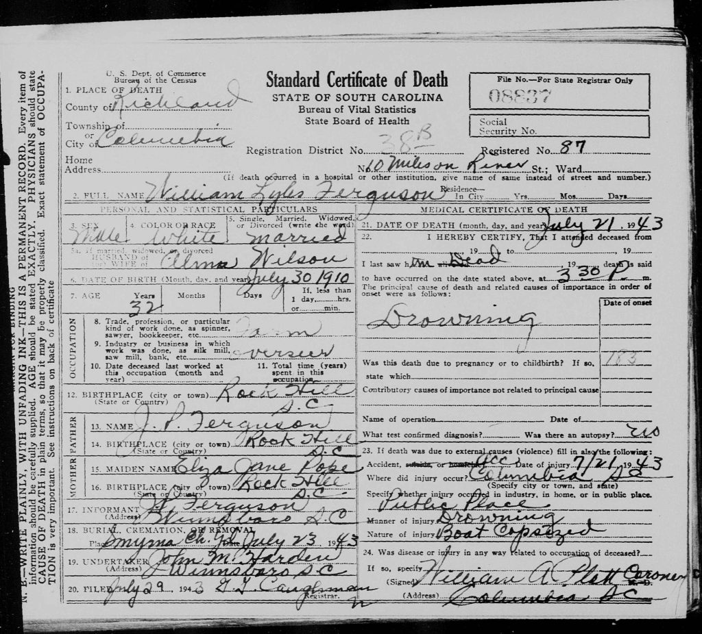 On July 22, 1943, William Lyles Ferguson was mentioned in the newspaper article, “Man Drowns In Congaree.”