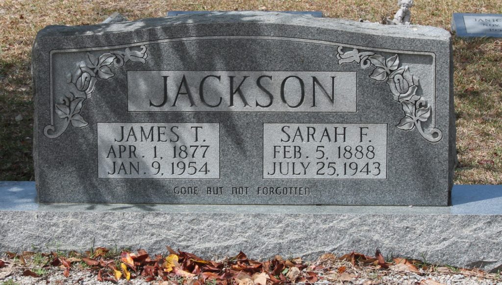 Sarah F. Jackson, 55, of Blaney passed away on July 25, 1943. She was buried in Hardshell Cemetery, in Lugoff. She was survived by her husband, James T. Jackson.