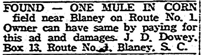 FOUND – ONE MULE IN CORN field near Blaney on Route No. 1. Owner can have same by paying for this ad and damages. J. D. Dowey, Box 13, Route No. 1, Blaney, S. C.