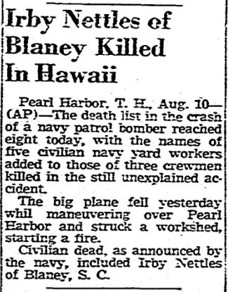Civilian dead, as announced by the navy included Irby Nettles of Blaney, S. C.