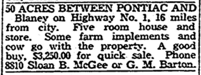 50 ACRES BETWEEN PONTIAC AND Blaney on Highway No. 1, 16 miles from city. Five room house and store. Some farm implements and cow go with the property. A good buy, $3,250.00 for quick sale. Phone 8810 Sloan B. McGee or G. M. Barton.