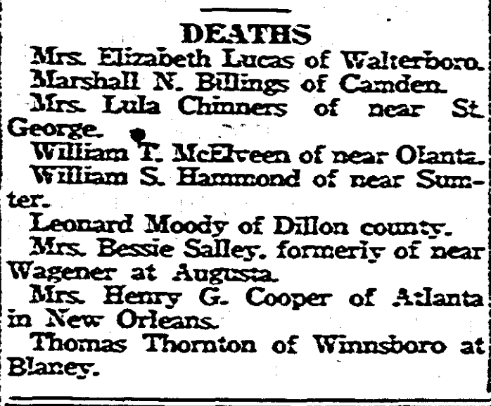 Mrs. Bessie Salley, formerly of near Wagener at Augusta.