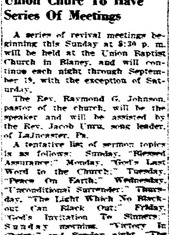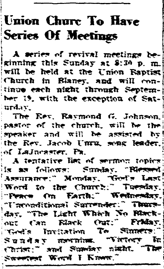 A series of revival meetings beginning this Sunday at 8:30 p.m. will be held at the Union Baptist Church in Blaney, and will continue each night through September 19, with the exception of Saturday.