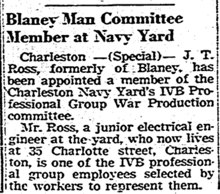 Charleston – (Special) – J. T. Ross, formerly of Blaney, has been appointed a member of the Charleston Navy Yard’s IVB Professional Group War Production committee.