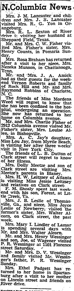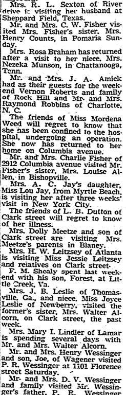 Mr. and Mrs. Henry Wessinger and son, Joe< of Wagener visited P. R. Wessinger at 1101 Florence street Saturday.