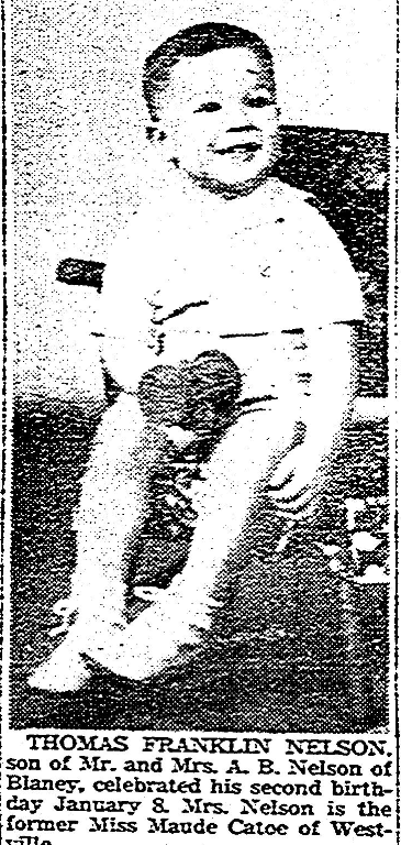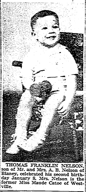 Thomas Franklin Nelson, son of Mr. and Mrs. A. B. Nelson of Blaney, celebrated his second birthday January 8. Mrs. Nelson is the former Miss Maude Cato of Westville.