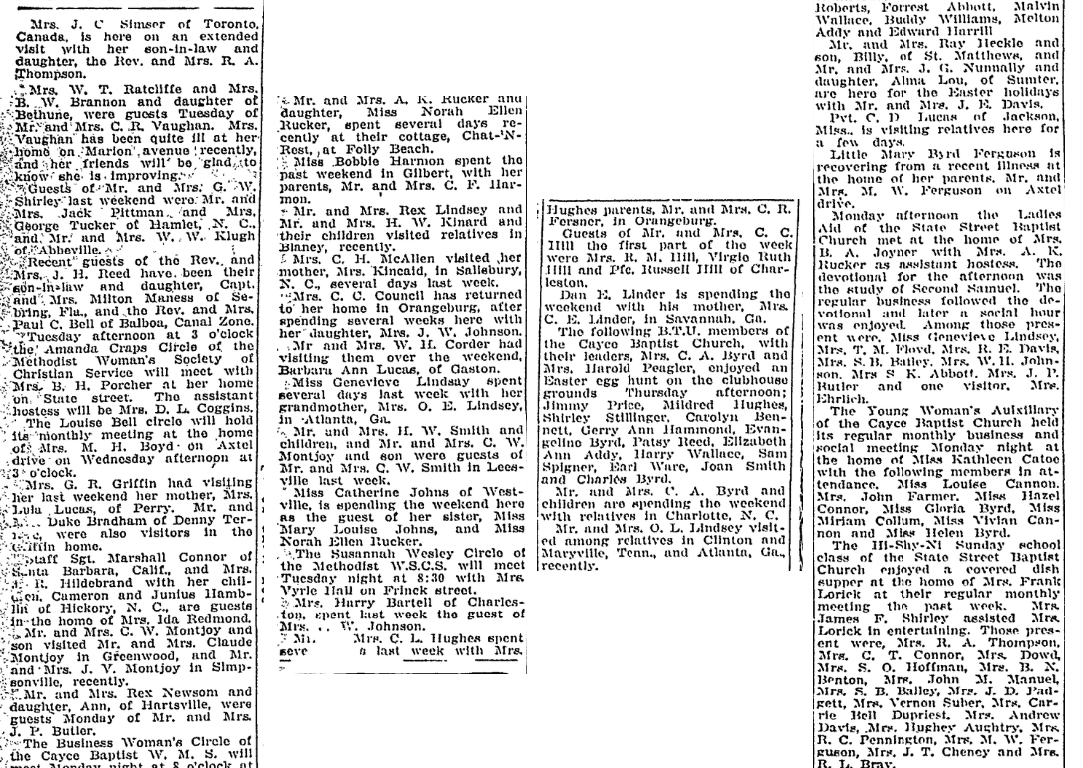 The young Woman’s Auixillary of the Cayce Baptist Church held its regular monthly business and social meeting Monday night at the home of Miss Kathleen Catoe with the following member in attendance, Miss Louise Cannon. Mrs. John Farmer, Miss Hazel Connor, Miss Gloria Byrd, Miss Miriam Collum, Miss Vivian Cannon and Miss Helen Byrd.