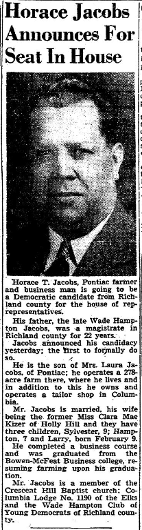 Mr. Jacobs is married, Mrs Jacobs being the former Miss Clara Mae Kizer of Holly Hill, and they have three children, Sylvester, 9; Hampton, 7; and Larry, born February 9.