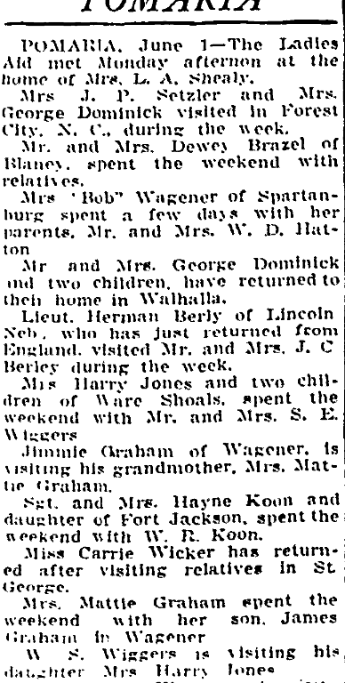 Mrs. Mattie Graham spent the weekend with her son, James Graham in Wagener.