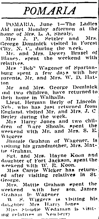 POMARIA, June 1 – The Ladies Aid met Monday afternoon at the home of Mrs. L. A. Shealy.