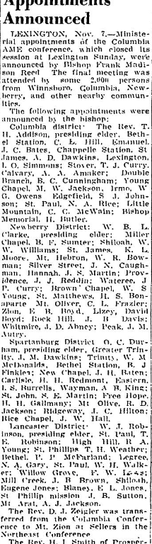 LEXINGTON, Nov. 7. – Ministerial appointments of the Columbia AME conference, which closed its session at Lexington Sunday, were annouce by Bishop Frank Madison Reed. The final meeting was attended by some 2,000 persons from Winnsboro, Columbia, Newberry, and other nearby communities.