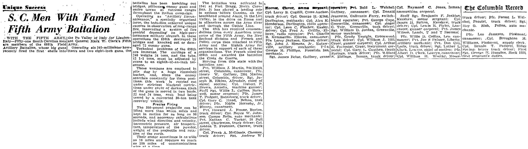 WITH THE FIFTH ARMY, Italy – Fifty-one South Carolina men are members of the 689th Field Artillery Battalion, whose big guns recently fired the first shells into the Po Valley of Italy for Lieutenant General Mark W. Clark’s Fifth Army.