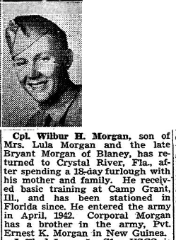 Cpl. Wilbur H. Morgan, son of Mrs. Lula Morgan and the late Bryant Morgan of Blaney, has returned to Crystal River, Fla., after spending an 18-day furlough with his mother and family. He received basic training at Camp Grant, Illinois, and has been stationed in Florida since. He entered the army in April, 1942. Corporal Morgan has a brother in the army, Pvt. Earnest K Morgan in New Guinea.