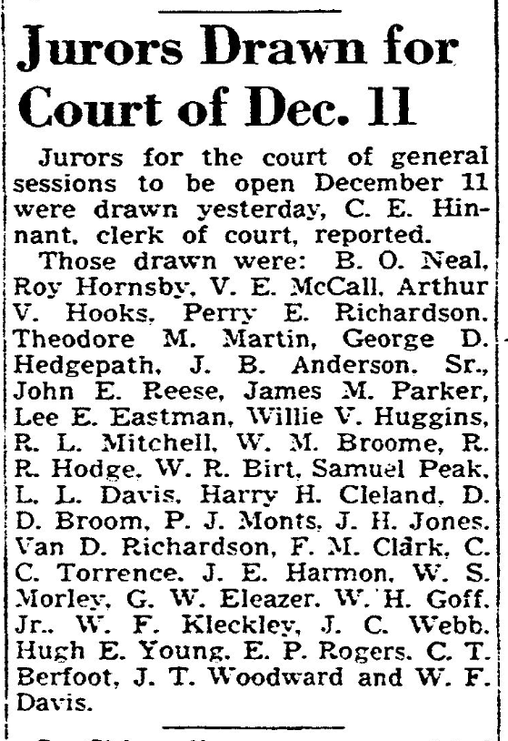Those drawn were: B. O. Neal, Roy Hornsby, V. E. McCall, Arthur V. Hooks, Perry E. Richardson, Theodore M. Martin, George D. Hedgepath, J. B. Anderson, Sr., John E. Reese, James M. Parker, Lee E. Eastman, Willie V. Huggins, R. L. Mitchell, W. M. Broome, R. R. Hodge, W. R. Birt, Samuel Peak, L. L. Davis, Harry H. Cleland, D. D. Broom, P. J. Monts, J. H. Jones, Van D. Richardson, F. M. Clark, C. C. Torrence, J. E. Harmon, W. S. Morley, G. W. Eleazer, W. H. Goff, Jr., W. F. Kleckley, J. C. Webb, Hugh E. Young, E. P. Rogers, C. T. Berfoot, J. T. Woodward and W. F. Davis.