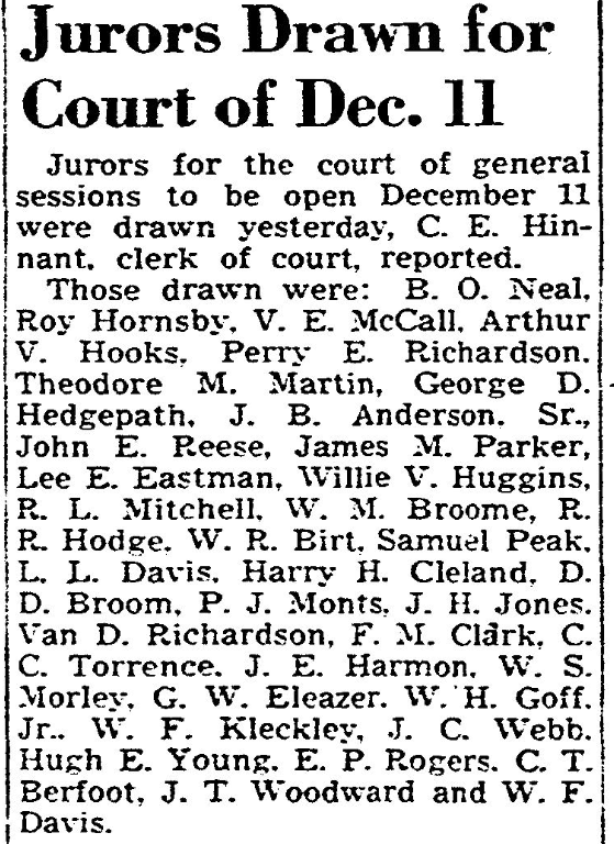 Those drawn were: B. O. Neal, Roy Hornsby, V. E. McCall, Arthur V. Hooks, Perry E. Richardson, Theodore M. Martin, George D. Hedgepath, J. B. Anderson, Sr., John E. Reese, James M. Parker, Lee E. Eastman, Willie V. Huggins, R. L. Mitchell, W. M. Broome, R. R. Hodge, W. R. Birt, Samuel Peak, L. L. Davis, Harry H. Cleland, D. D. Broom, P. J. Monts, J. H. Jones, Van D. Richardson, F. M. Clark, C. C. Torrence, J. E. Harmon, W. S. Morley, G. W. Eleazer, W. H. Goff, Jr., W. F. Kleckley, J. C. Webb, Hugh E. Young, E. P. Rogers, C. T. Berfoot, J. T. Woodward and W. F. Davis.