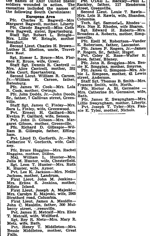 Washington, Jan. 27 – (AP) – The war department made public today the names of 2,637 United States soldiers wounded in action. The casualties included the names of the following South Carolinians: