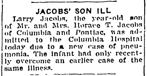 Larry Jacobs, the year-old son of Mr. and Mrs. Horace T. Jacobs (Clara Mae Jacobs) of Columbia and Pontiac, was admitted to the Columbia Hospital today due to a new case of pneumonia. The infant had only recently overcome an earlier case of the same illness. Continue reading JACOBS’ SON ILL