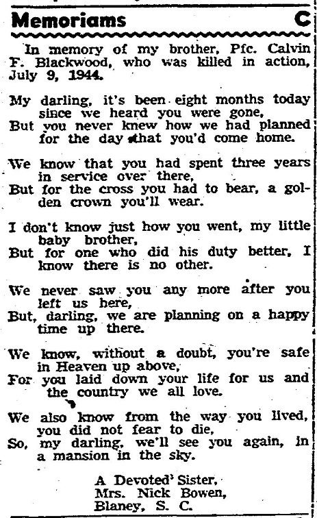 In memory of my brother, Pfc. Calvin F. Blackwood, who was killed in action, July 9, 1944.