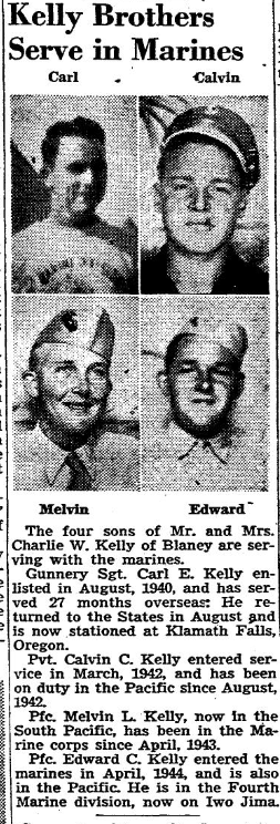 Pfc. Edward C. Kelly entered the marines in April, 1944, and is also in the Pacific. He is in the Fourth Marine division, now on Iwo Jima.