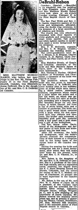 Camden— (Special) – Beautiful in its simplicity was the wedding of Miss Elizabeth Anne DeBruhl and Rev. Matthew Murdic Rabon which took place Tuesday evening, at six o’clock February 27 in the First Baptist church of Camden.