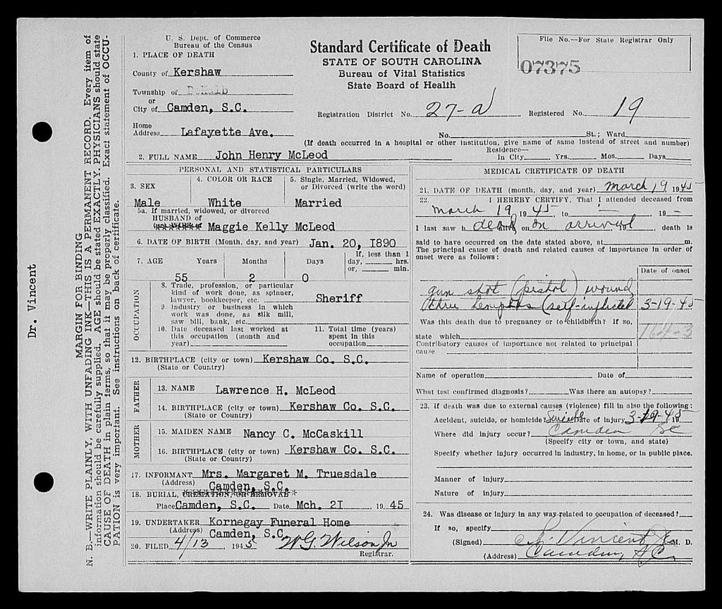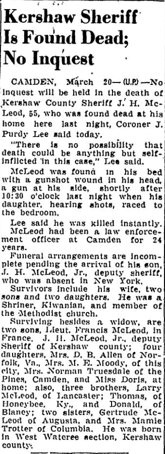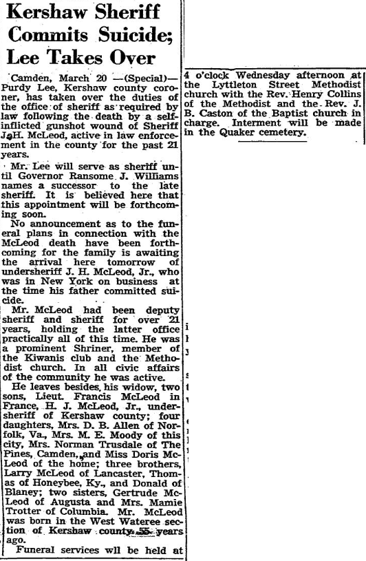 He leaves besides, his widow, two sons, Lieut. Francis McLeod in France, H. J. McLeod, Jr., undersheriff of Kershaw county; four daughters, Mrs. D. B. Allen of Norfolk, Va., Mrs. M. E. Moody of this city, Mrs. Norman Trusdale of The Pines, Camden, and Miss Doris McLeod of the home; three brothers, Larry McLeod of Lancaster, Thomas of Honeybee, Ky., and Donald of Blaney: two sisters, Gertrude McLeod of Augusta and Mrs. Mamie Trotter of Columbia. Mr. McLeod was born in the West Wateree section of Kershaw county 55 years ago.