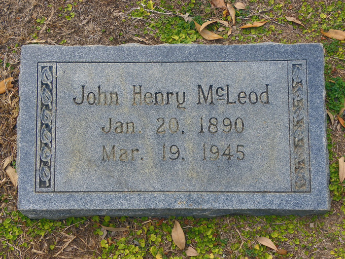 John Henry McLeod was counted in the census on 22 Apr 1940 in Camden, Kershaw, South Carolina, USA, as a 50-year-old, male, married, white, head of household. Also in the home were; his wife; Maggie Kelly McLeod; his children, John Henry McLeod, Francis Dekalb McLeod, Emily Louise McLeod, Rhetta Katherine McLeod, and Lillian Doris McLeod; and his father, Dekalb Kelley.