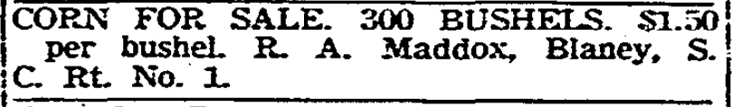 Today in HistoryCORN FOR SALE, 300 BUSHELS CORN FOR SALE, 300 BUSHELS. $1.50 per bushel. R. A. Maddox, Blaney, S. C. Rt. No. 1. April 28, 1945 State (published as The State) Columbia, South Carolina Page 8
