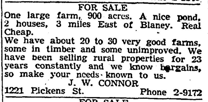 One large farm, 900 acres, A nice pond, 2 houses, 3 miles East of Blaney, Real Cheap.
