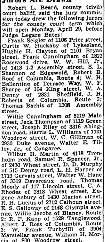 The Richland county jury commission met today and drew the Common Pleas jury panel for the second week of Common Please jury panel for the second week of Common Pleas court in the May term. (The second week opens May 13). The panel follows: James C. Siokos of 1411 Geiger avenue, J. D. Derrick, Jr., of Irmo, Route 1; Frank W. Ketchen of 2905 Duncan … Continue reading Jurors Are Drawn