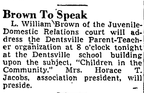 L. William Brown of the Juvenile-Domestic Relations court will address the Dentsville Parent-Teacher organization at 8 o’clock tonight at the Dentsville school building upon the subject, “Children in the Community.” Mrs. Horace T. Jacobs, association president, will preside.