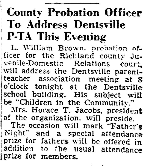 L. William Brown, Probation officer for the Richland county Juvenile-Domestic Relations court, will address the Dentsville parent-teacher association meeting at 8 o’clock tonight at the Dentsville school building. His subject will be “Children in the Community.”
