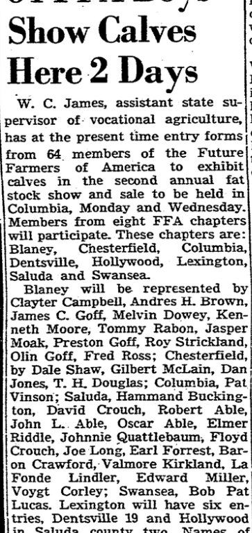 W. C. James, assistant state supervisor of vocational agriculture, has at the present time entry forms from 64 embers of the Future Farmers of America to exhibit calves in the second annual fat stock show and sale to be held in Columbia, Monday and Wednesday. Member from eight FFA chapters will participate. These chapters are: Blaney, Chesterfield, Columbia, Dentsville, Hollywood, Lexington, Saluda and Swansea.
