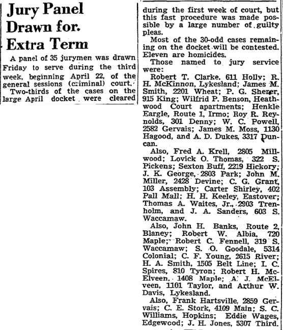 Also, Fred A. Krell, 2805 Millwood; Lovick O. Thomas, 322 S. Pickens; Sexton Buff, 2219 Hickory; J. K. George, 2803 Park; John M. Miller, 2428 Devine; C. G. Grant, 103 Assembly; Carter Shirely, 402 Pall Mall; H. H. Keely, Eastover; Thomas A Waites, Jr. 2901 Trenholm, and J.A. Sanders, 603 S Waccamaw.