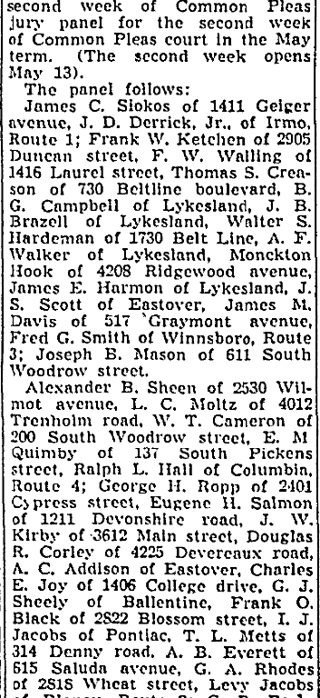 Alexander B. Sheen of Sheen of 2530 Wilmot avenue, L. C. Moltz of 4012 Trenholm road, W. T. Cameron of 200 South Woodrow street, E. M. Quimby of 137 SOuth Pickens street, Ralph L. Hall of Columbia, Route 4; George H. Ropp of 2401 Cypress street, Eugene H. Salmon of 1211 Devonshire road, J. W. Kirby of 3612 Main street, Douglas R. Corley of 4225 Devereaux road, A. C. Addison of Eastover, Charles E. Joy of 1406 College drive, G. J. Sheely of Ballentine, Frank O Black of 2822 Blossom street, I. J. Jacobs of Pontiac, T. L. Mets of 314 Denny road, A. B. Everettt of 515 Saulda avenue, G. A. Rhodes of 2818 Wheat street, Levy Jacobs of Blaney, Route 2; G. R. Beckham of Blythewood, Route 1; George E McCabe of 2200 Academy Way, and Clifford R. Raysor of 1626 Hollywood drive.