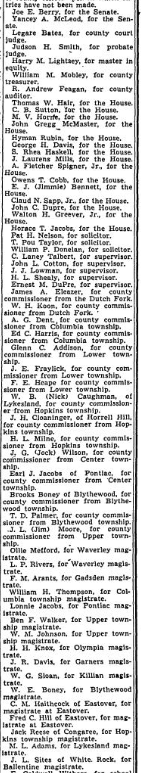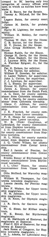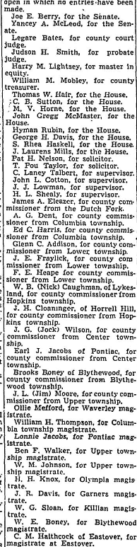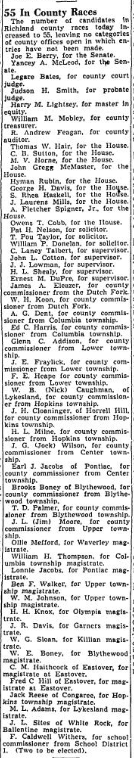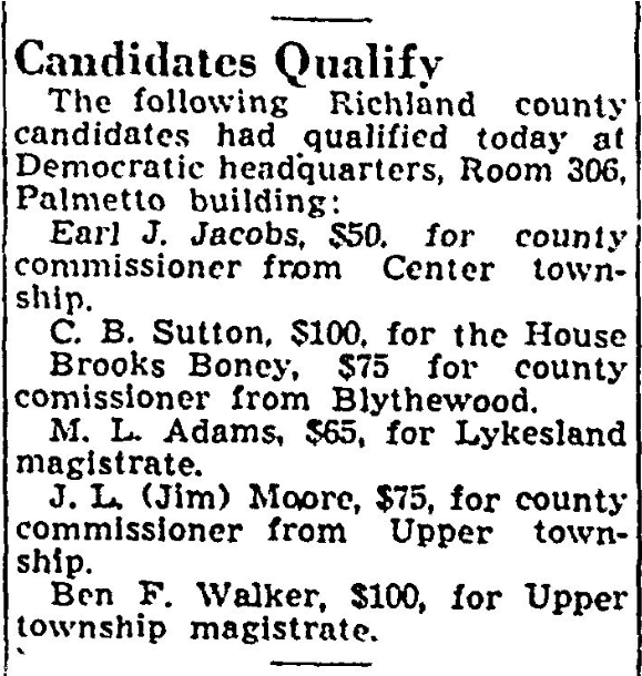 The number of candidates in Richland county races today increased to 63, leaving no categories of county offices open in which entries have not been made. Joe E. Berry, for the Senate. Yancey A McLeod, for the Senate. Legare Bates, for county court judge. Judson H. Smith, for probate judge. Harry M Lightsey, for master in equity. William M. Mobley, for county treasurer. R. Andrew … Continue reading 63 In County Races
