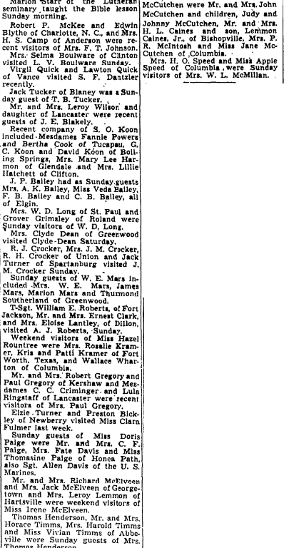 Sunday visitors of Miss Annie McCutchen were Mr. and Mrs. Jonh McCutchen and children, Judy and Johnny McCutchen, Mr. and Mrs. H. L. Caines and son, Lemmon Caines, Jr., of Bishopville, Mrs. P. R. McIntosh and Miss Jane McCutchen of Columbia.