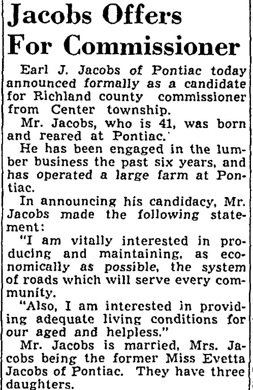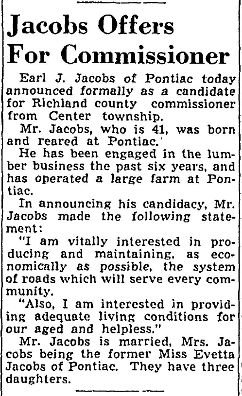 Earl J Jacobs of Pontiac today announced formally as a candidate for Richland county commissioner from Center township.
