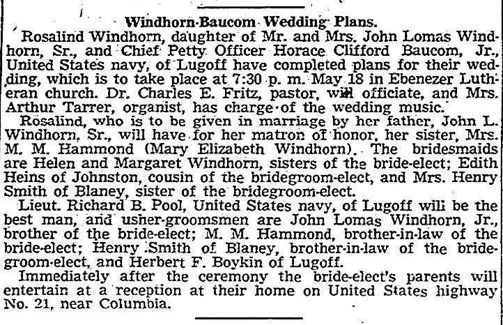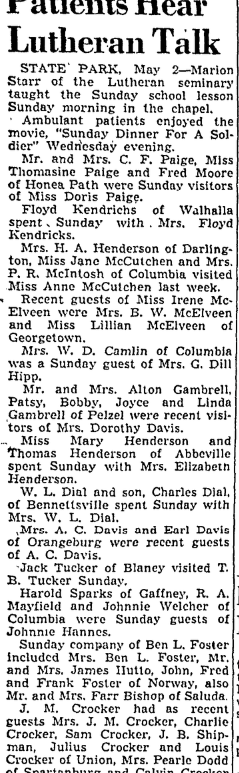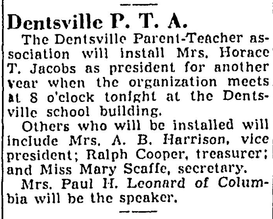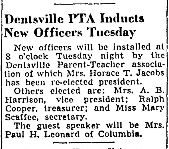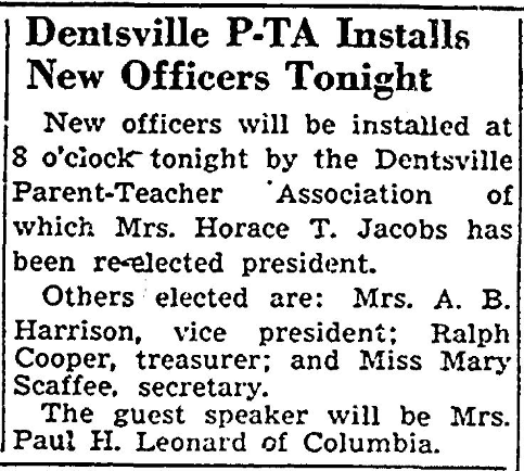 New officers will be installed at 8 o’clock Tuesday night by the Dentsville Parent-Teacher Association of which Mrs. Horace T. Jacobs has been re-elected president. Others elected are: Mrs. A. B. Harrison, vice president; Ralph Cooper, treasurer; and Miss Mary Scaffee, secretary. The guest speaker will be Mrs. Paul H. Leonard of Columbia. Continue reading Dentsville P-TA Installs New Officers Tonight