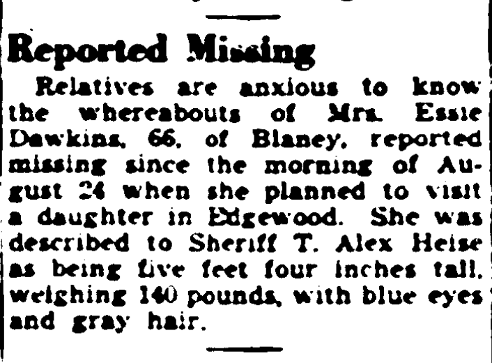 Relatives are anxious to know the whereabouts of Mrs. Essie Dawkins, 66, of Blaney, reported missing since the morning of August 24 when she planned to visit a daughter in Edgewood. She was described to Sheriff T. Alex Heise as being five feet Four inches tall, weighing 140 pounds, with blue eyes and gray hair.