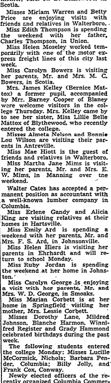The following students entered the college Monday; Misses Lucille McCormick, Nichols; Barbara Pender, Columbia; Billy Jolly, and Frank Cox, Conway.