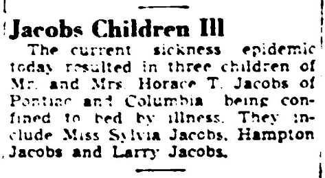 The current sickness epidemic today resulted in three children of Mr. and Mrs. Horace T. Jacobs (Clara Mae Jacobs) of Pontiac and Columbia being confined to bed by illness. They include Miss Sylvia Jacobs, Hampton Jacobs and Larry Jacobs.