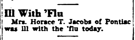 Today in HistoryIll With ‘Flu Mrs. Horace T. Jacobs of Pontiac was ill with the ‘flu today. March 24, 1947 Columbia Record (published as The Columbia Record) Columbia, South CarolinaPage 11