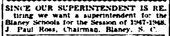 Since Our Superintendent Is Retiringwe want a superintendent for the Blaney School for the Session of 1947-1948. J. Paul Ross, Chairman, Blaney, S. C.