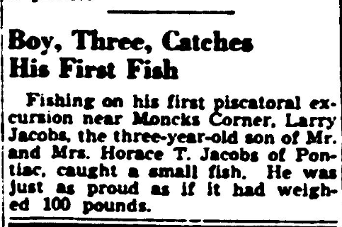 Fishing on his first piscatorial excursion near Moncks Corner, Larry Jacobs, the three-year-old son of Mr. and Mrs. Horace T. Jacobs (Clara Mae Jacobs) of Pontiac, caught a small fish. He was just as proud as if it had weighed 100 pounds.