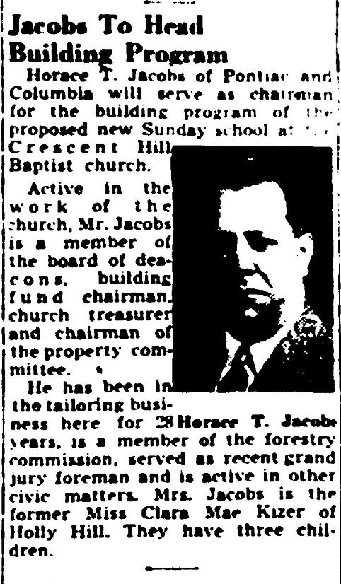 Horace T. Jacobs of Pontiac and Columbia will serve as chairman for the building program of the proposed new Sunday school at the Crescent Hill Baptist church.
