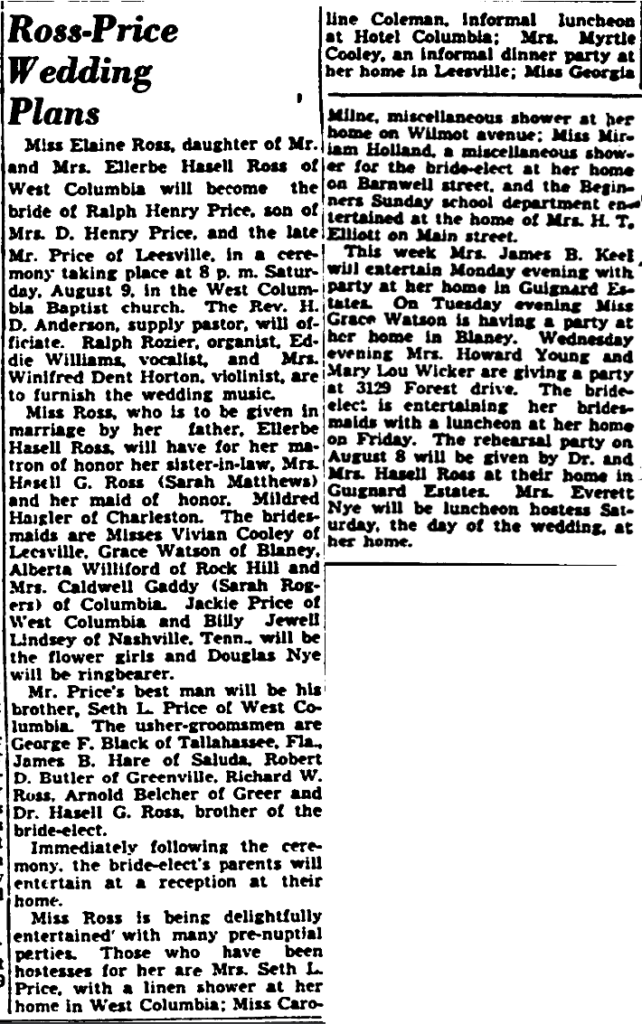Miss Elaine Ross, daughter of Mr. and Mrs. Ellerbe Hasell Ross (Gertrude Evans Ross) of West Columbia will become the bride of Ralph Henry Price, son of Mrs. D. Henry Price, and the late Mr. Price of Leesville, in a ceremony taking place at 8 p.m. Saturday, August 9, in West Columbia Baptist Church. The Rev. H. D. Anderson, supply pastor, will officiate. Ralph Rozier, organist, Eddie Williams, vocalist, and Mrs. Winifred Dent Horton, violinist, are to furnish the wedding music.