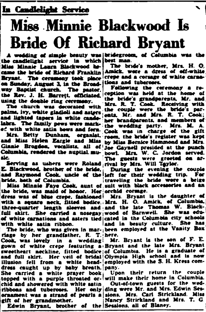 A wedding of simple beauty was the candlelight service in which Miss Minnie Laura Blackwood became the bride of Richard Franklin Bryant. The ceremony took place on Sunday, August 3, in the Broadway Baptist church. The pastor, the Rev. J. H. Barrett, officicated, using the double ring ceremony.