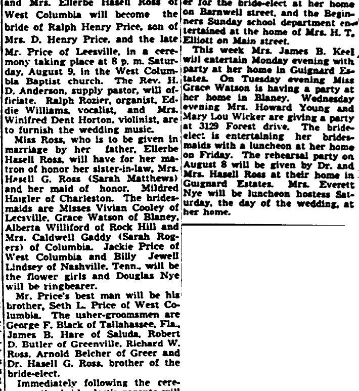 Miss Elaine Ross, daughter of Mr. and Mrs. Ellerbe Hasell Ross (Gertrude Evans Ross) of West Columbia will become the bride of Ralph Henry Price, son of Mrs. D. Henry Price, and the late Mr. Price of Leesville, in a ceremony taking place at 8 p.m. Saturday, August 9, in West Columbia Baptist Church. The Rev. H. D. Anderson, supply pastor, will officiate. Ralph Rozier, … Continue reading Ross-Price Wedding Plans