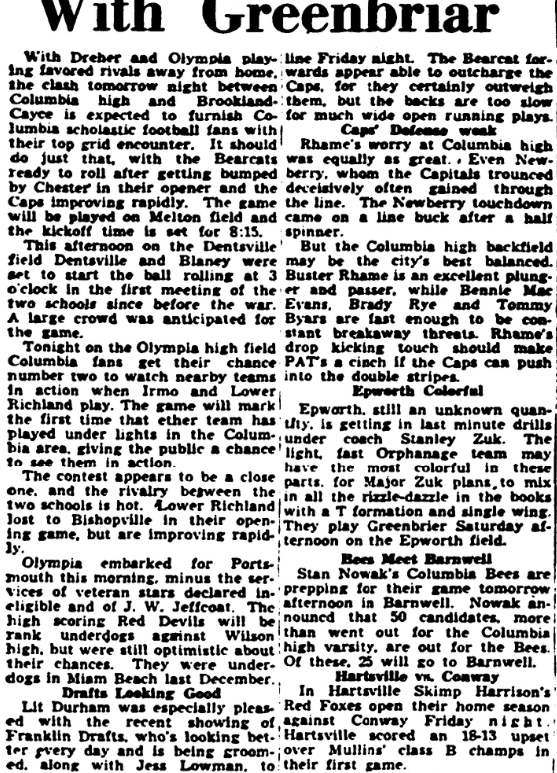With Dreher and Columbia rapidly improving. Epworth off to a flying start, Brookland-Cayce in a revengeful mood with a capable team, and Olympia over their toughest hurdle, the city high school football program is developing into a wide open scramble for top honors. Dreher’s game with Winnsboro Friday night should produce the answer to the question of the Blue Devil’s potential strength. They’ve lost twice … Continue reading City Grid Scramble Wide Open